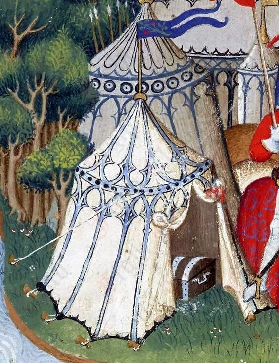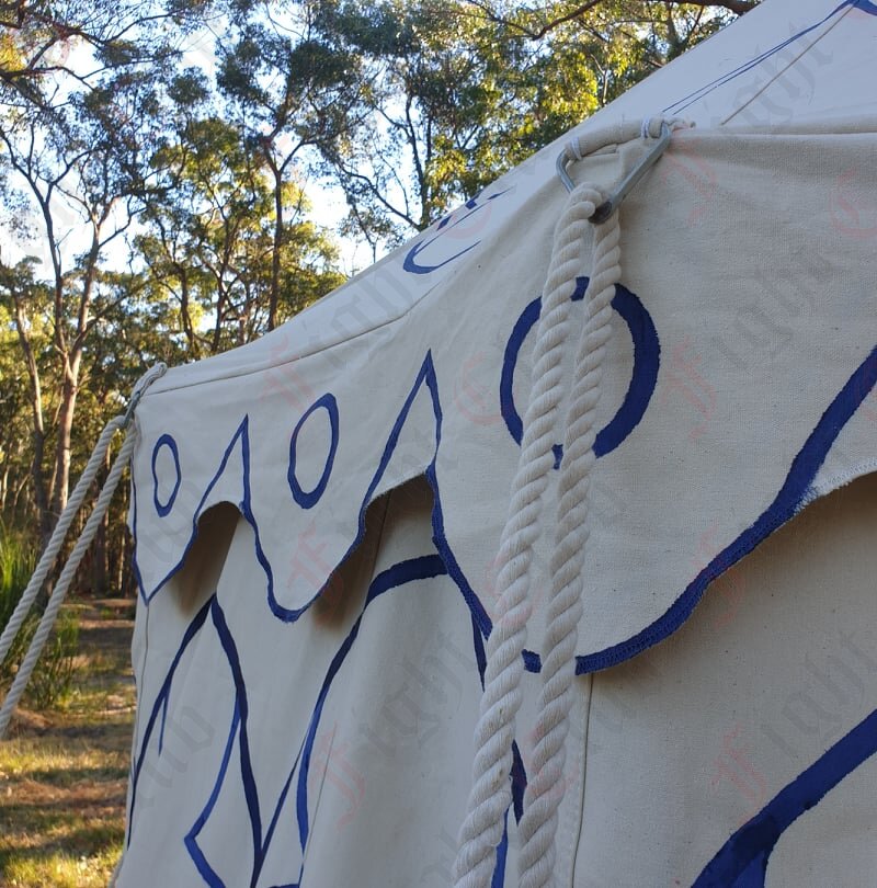 14th Century style painted tent with water repellent heavy duty canvas and spoked wheel hub. No wall poles are required but simple extendable tent poles can be used to add even more stability.